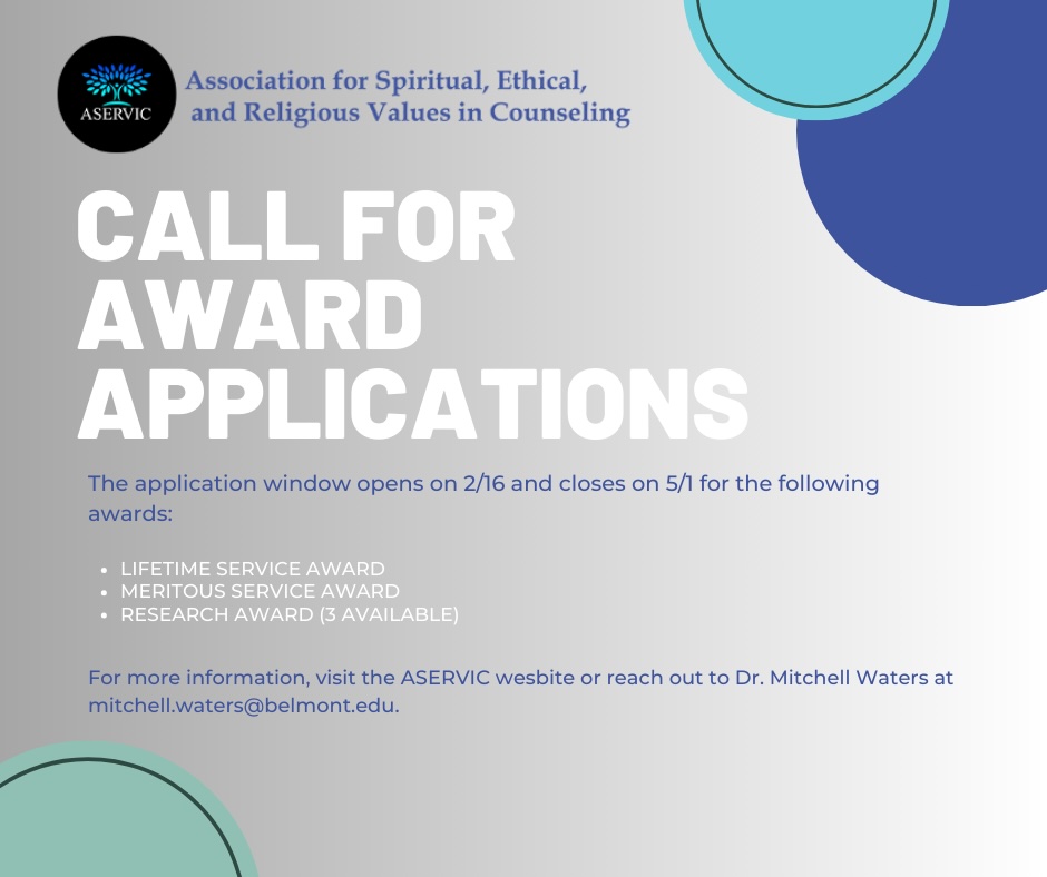 The Association for Spiritual, Ethical, and Religious Values in Counseling is excited to recognize outstanding contributions to the field of counseling. In an effort to identify those recipients who are especially deserving, we ask that you take time to consider the accomplishments of your colleagues, mentors, and mentees who are worthy of nomination for one or more ASERVIC awards.
